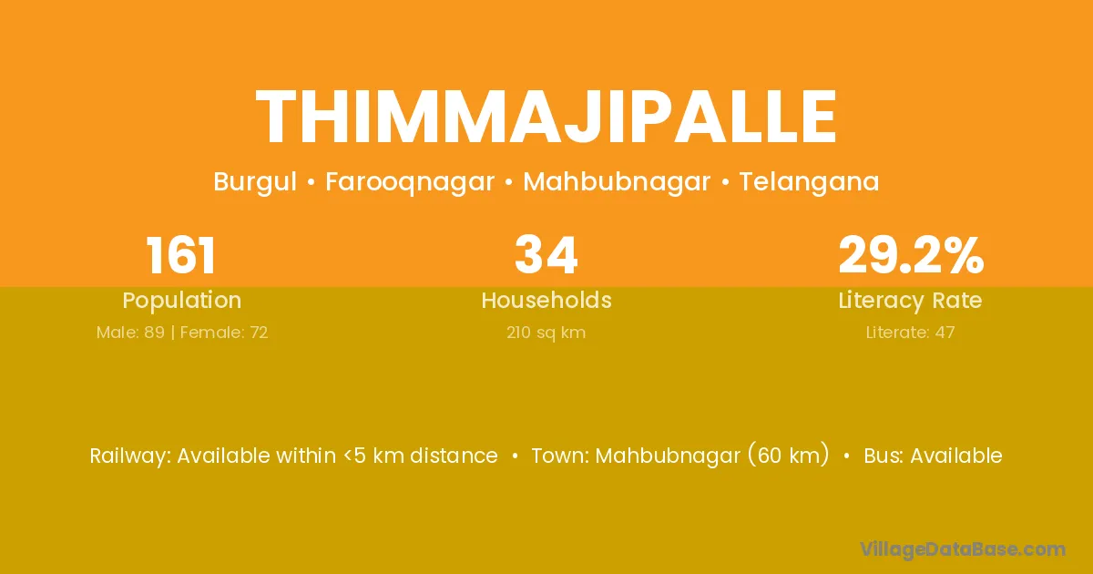 Mahbubnagar (60 km) is the nearest town to Thimmajipalle village for major economic activities and is located approximately 60 km away.