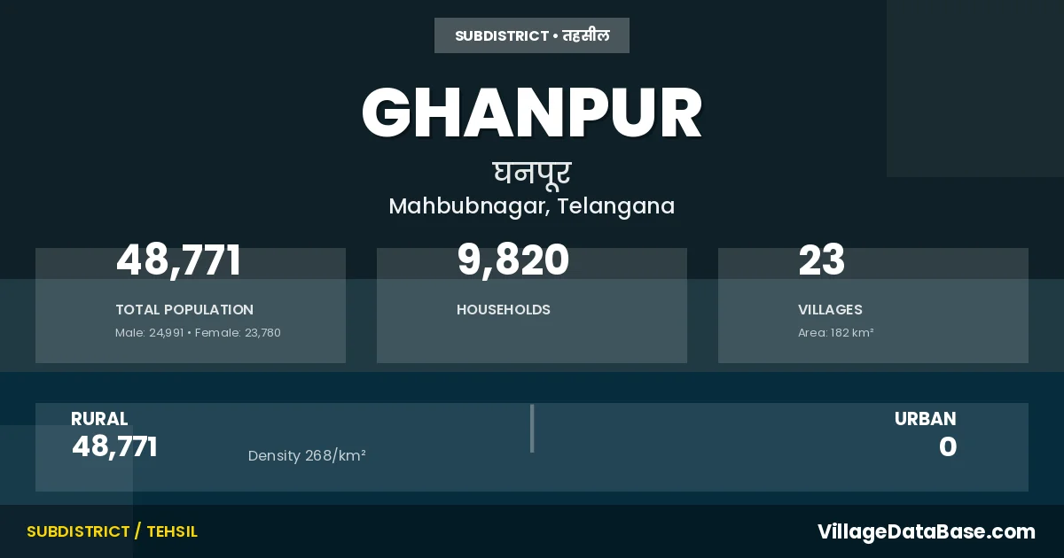 According to the 2011 census The total area of Ghanpur Mandal is 182 km², with a population of 48771 people. The population density is 268 inhabitants per square kilometre, and there are approximately 9820 houses in the sub district.