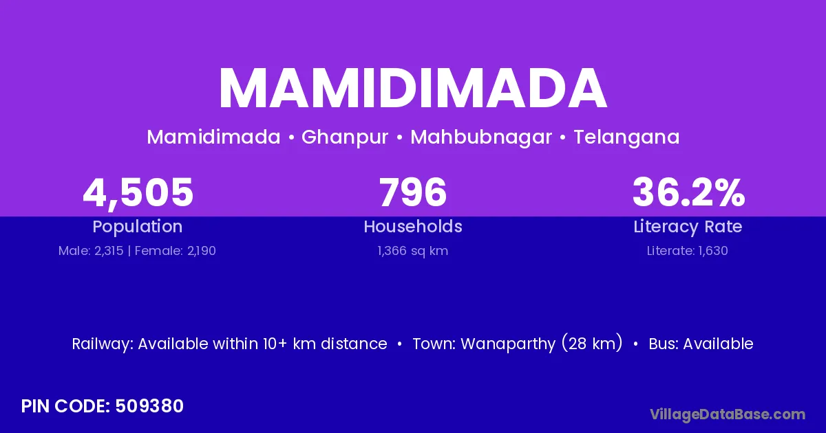 Wanaparthy (28 km) is the nearest town to Mamidimada village for major economic activities and is located approximately 28 km away.