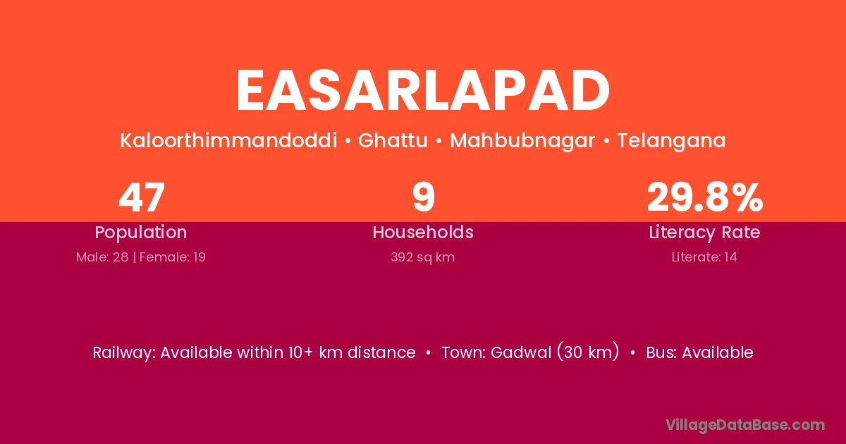 Gadwal (30 km) is the nearest town to Easarlapad village for major economic activities and is located approximately 30 km away.