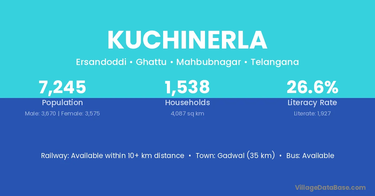 Gadwal (35 km) is the nearest town to Kuchinerla village for major economic activities and is located approximately 35 km away.