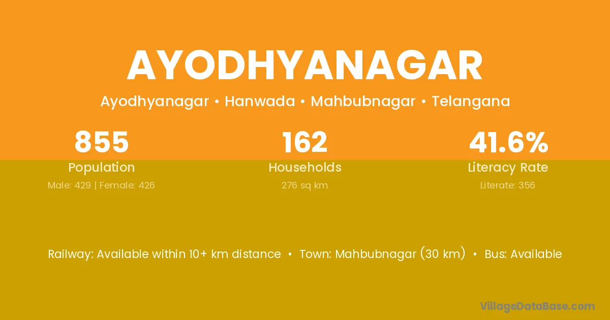 Mahbubnagar (30 km) is the nearest town to Ayodhyanagar village for major economic activities and is located approximately 30 km away.
