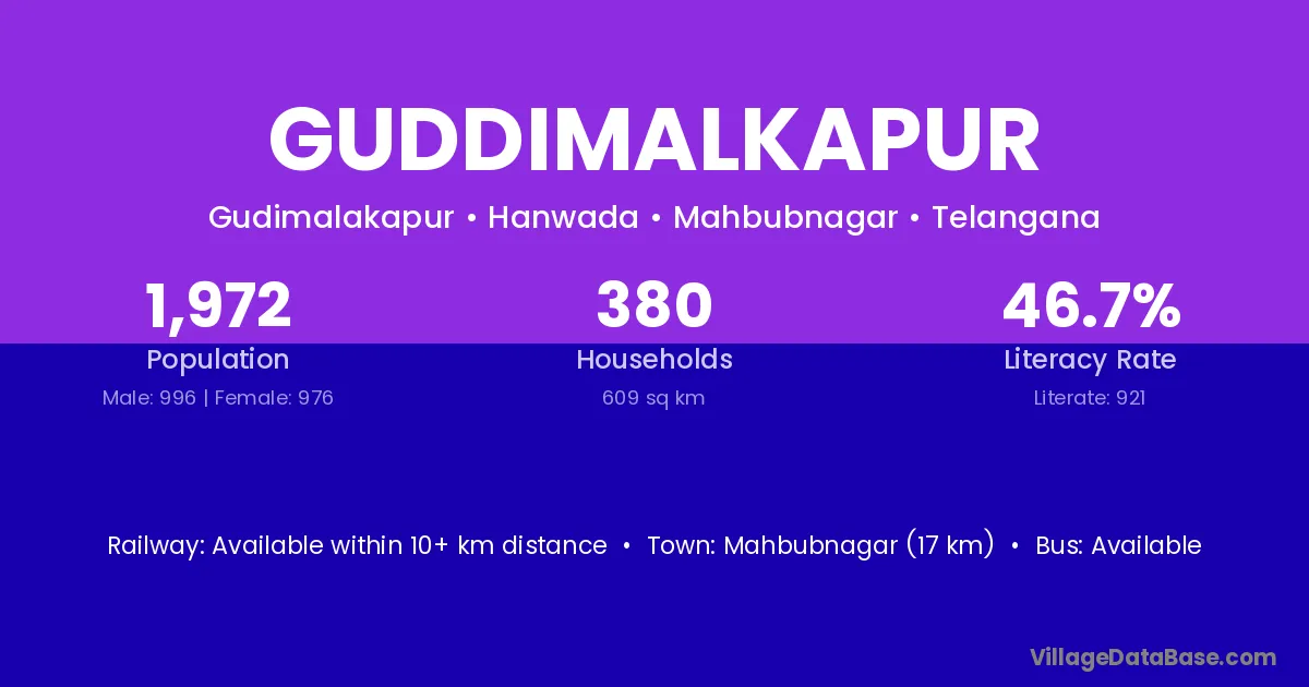 Mahbubnagar (17 km) is the nearest town to Guddimalkapur village for major economic activities and is located approximately 17 km away.