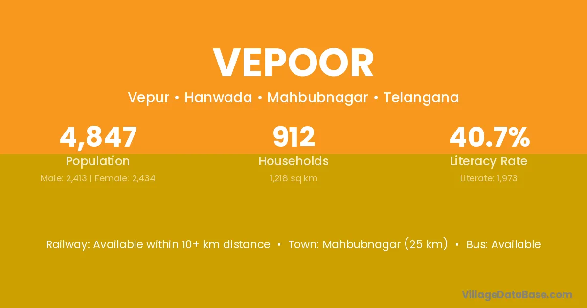 Mahbubnagar (25 km) is the nearest town to Vepoor village for major economic activities and is located approximately 25 km away.