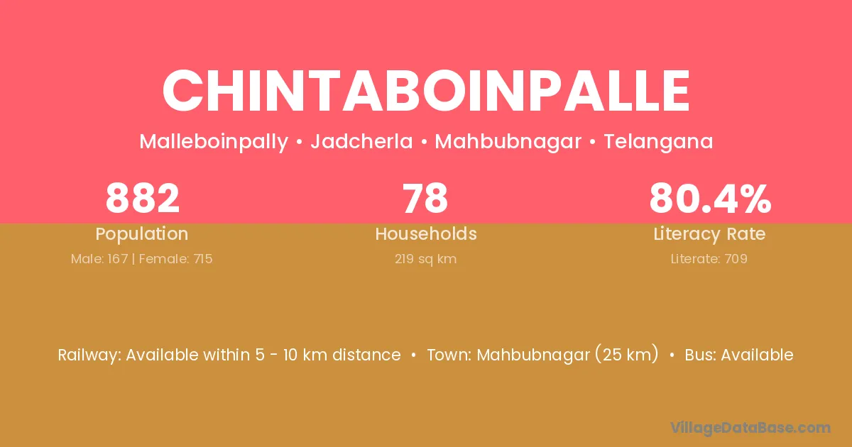 Mahbubnagar (25 km) is the nearest town to Chintaboinpalle village for major economic activities and is located approximately 25 km away.