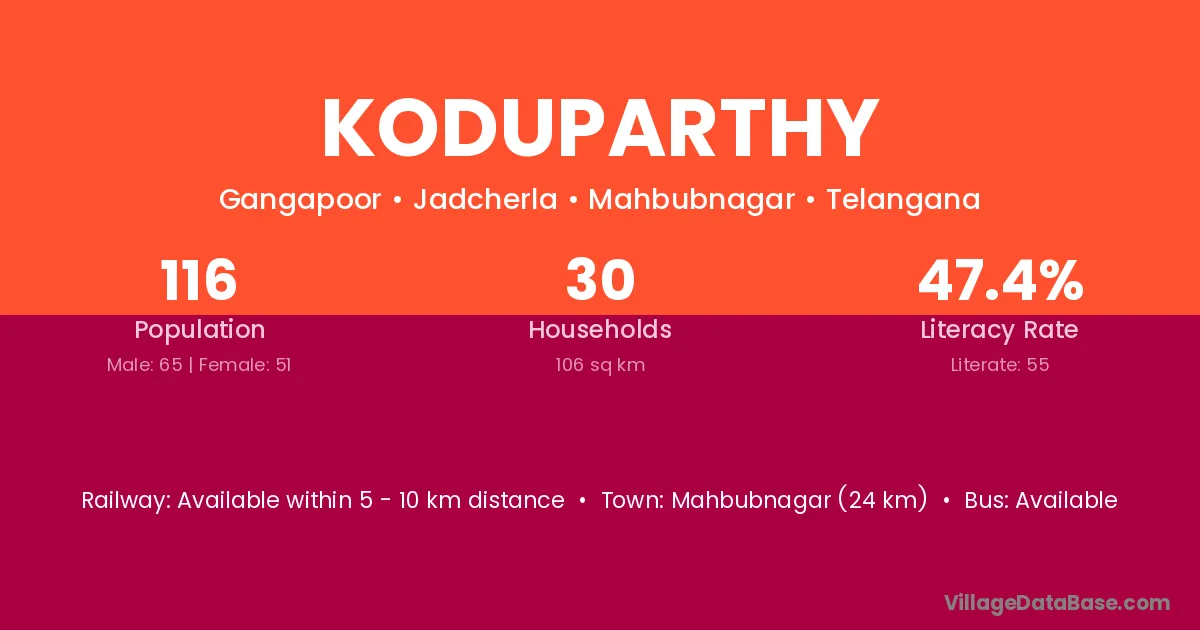 Mahbubnagar (24 km) is the nearest town to Koduparthy village for major economic activities and is located approximately 24 km away.