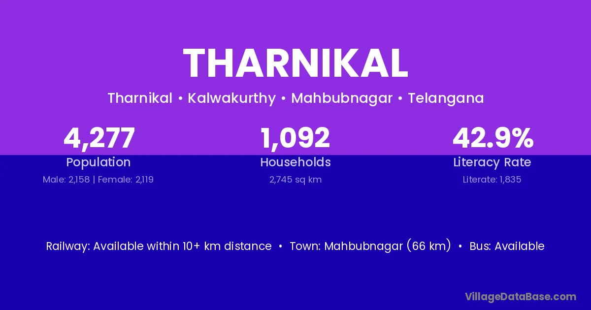 Mahbubnagar (66 km) is the nearest town to Tharnikal village for major economic activities and is located approximately 66 km away.