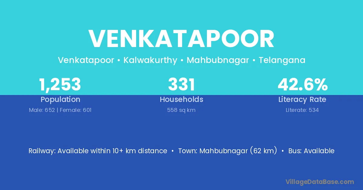 Mahbubnagar (62 km) is the nearest town to Venkatapoor village for major economic activities and is located approximately 62 km away.