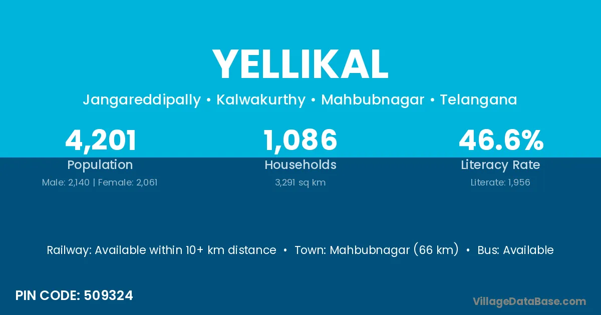 Mahbubnagar (66 km) is the nearest town to Yellikal village for major economic activities and is located approximately 66 km away.