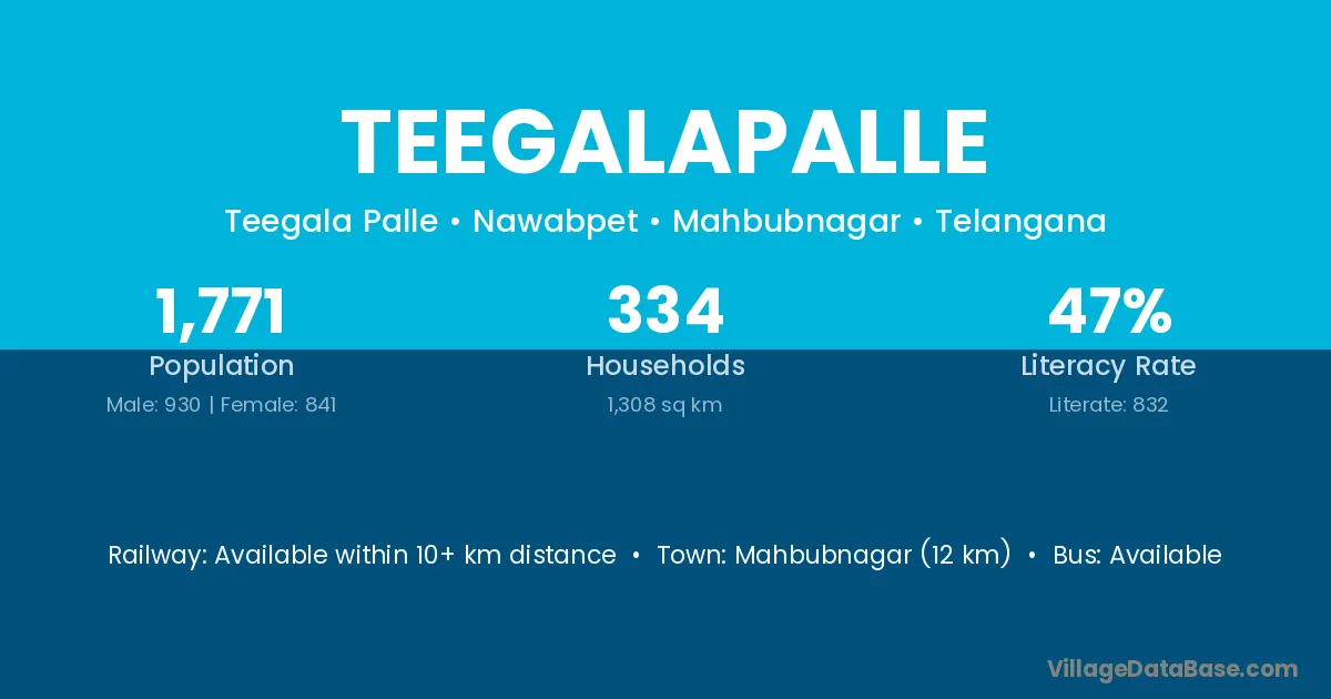 Wanaparthy (30 km) is the nearest town to Teegalapalle village for major economic activities and is located approximately 30 km away.
