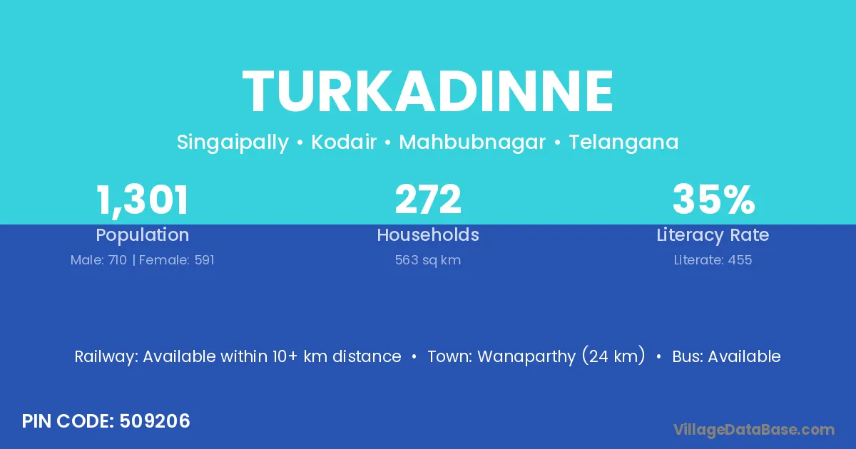 Wanaparthy (24 km) is the nearest town to Turkadinne village for major economic activities and is located approximately 24 km away.