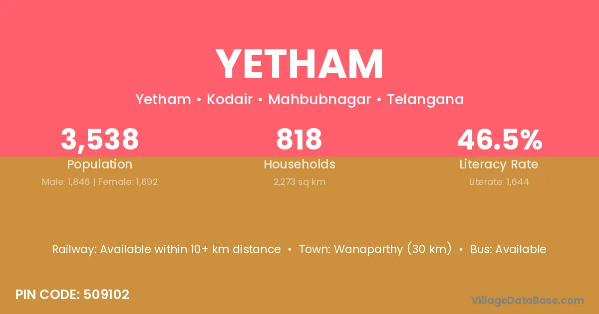 Wanaparthy (30 km) is the nearest town to Yetham village for major economic activities and is located approximately 30 km away.