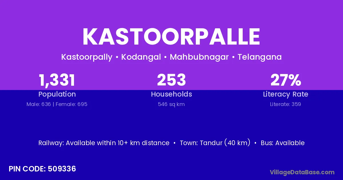 Tandur (40 km) is the nearest town to Kastoorpalle village for major economic activities and is located approximately 40 km away.