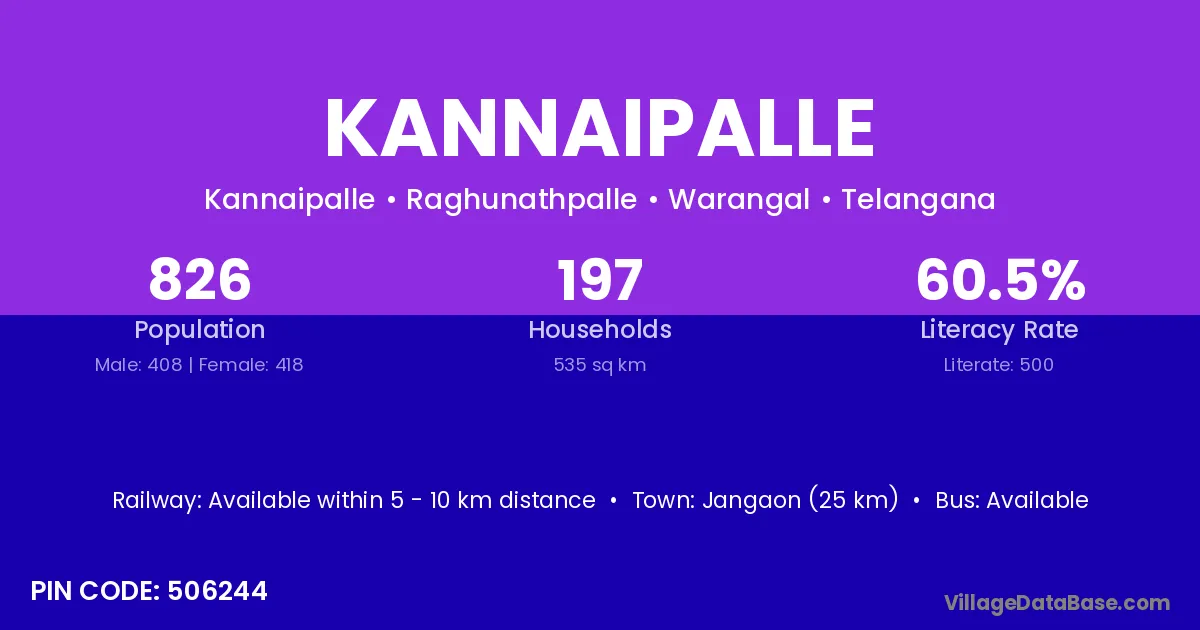 The literacy rate of Kannaipalle village is 40.66%. Male literacy stands at 48.75% and female literacy at 32.24%.