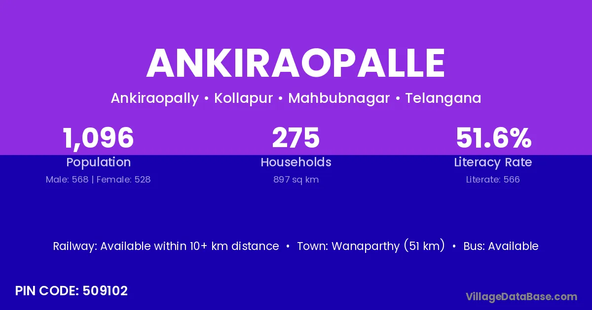 Wanaparthy (51 km) is the nearest town to Ankiraopalle village for major economic activities and is located approximately 51 km away.