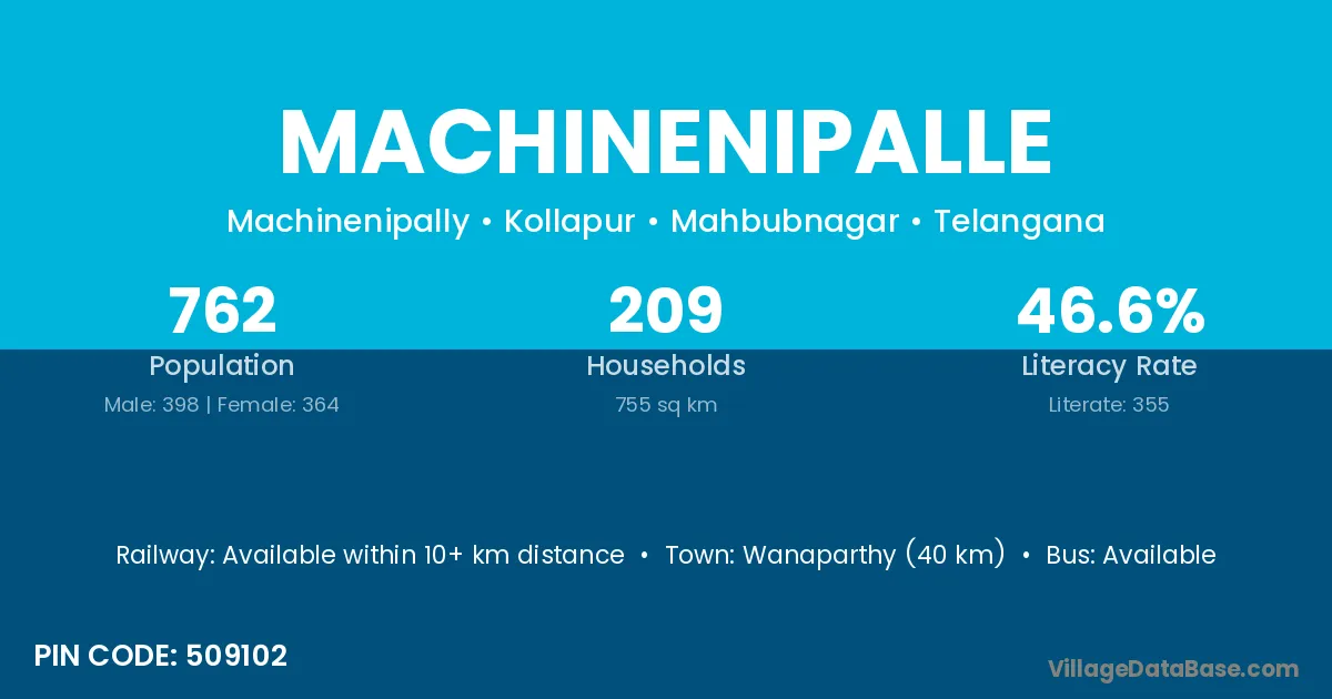 Wanaparthy (40 km) is the nearest town to Machinenipalle village for major economic activities and is located approximately 40 km away.