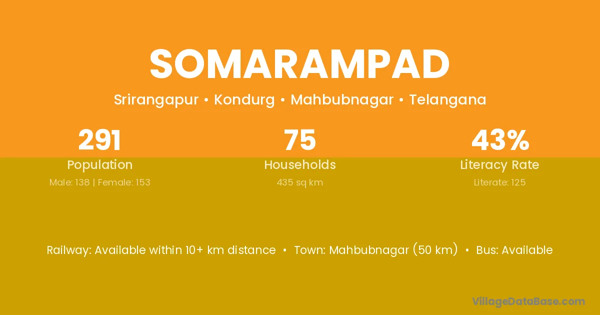 Mahbubnagar (50 km) is the nearest town to Somarampad village for major economic activities and is located approximately 50 km away.
