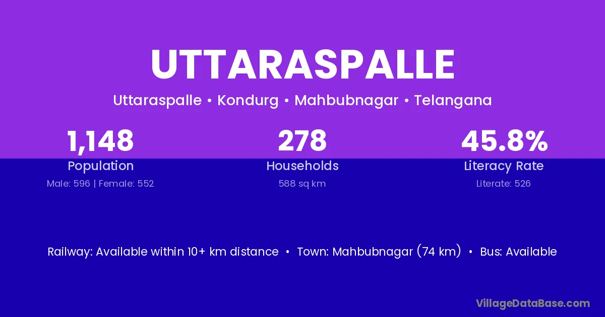 Mahbubnagar (74 km) is the nearest town to Uttaraspalle village for major economic activities and is located approximately 74 km away.
