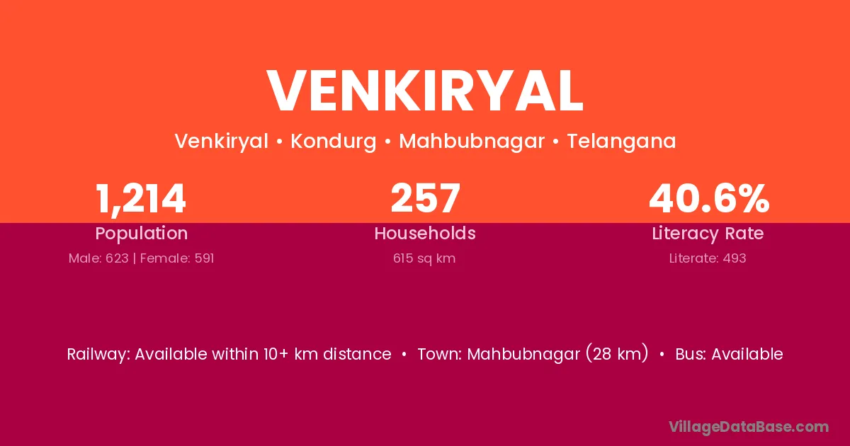 Venkiryal village has a total population of 1,214 people, of which 623 are males and 591 are females.