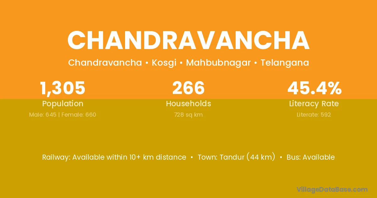 Tandur (44 km) is the nearest town to Chandravancha village for major economic activities and is located approximately 44 km away.