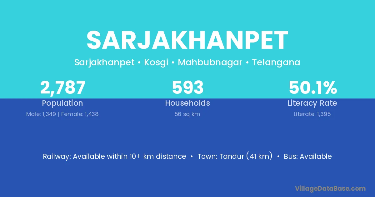 Tandur (41 km) is the nearest town to Sarjakhanpet village for major economic activities and is located approximately 41 km away.