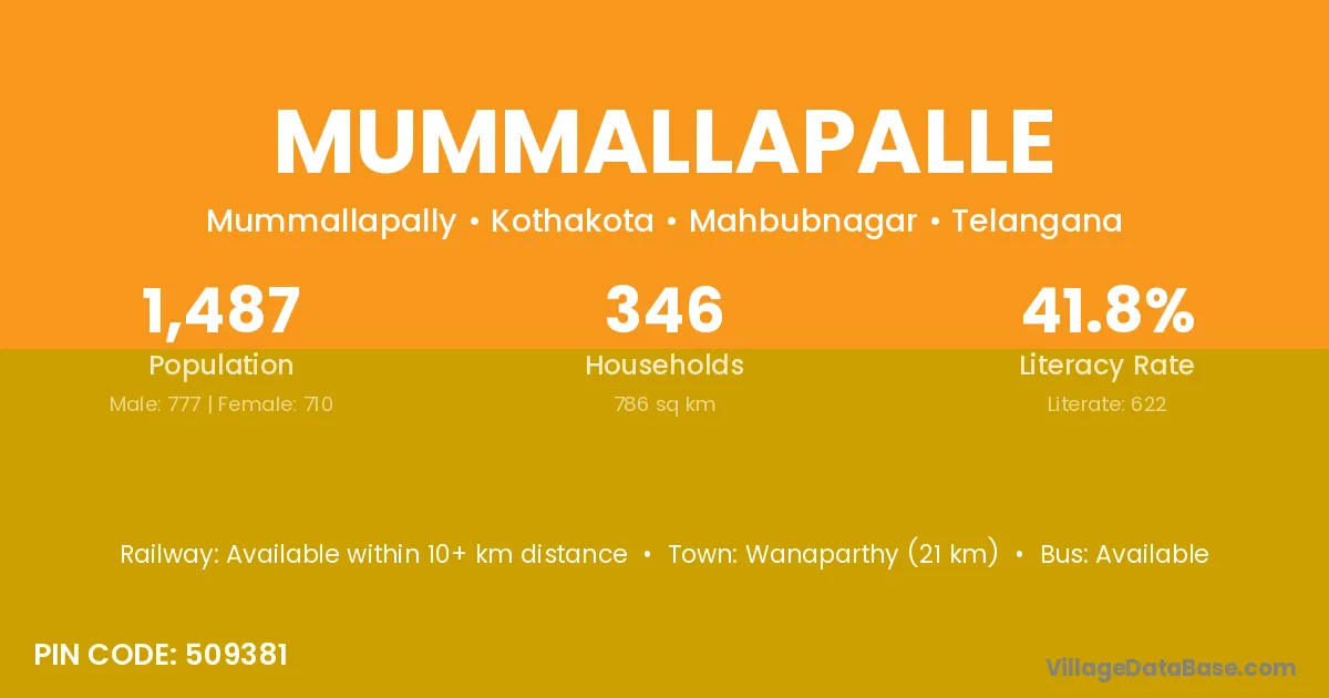Wanaparthy (21 km) is the nearest town to Mummallapalle village for major economic activities and is located approximately 21 km away.