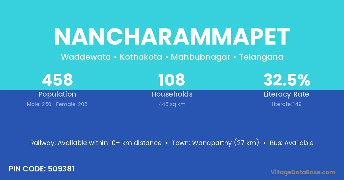 Wanaparthy (27 km) is the nearest town to Nancharammapet village for major economic activities and is located approximately 27 km away.