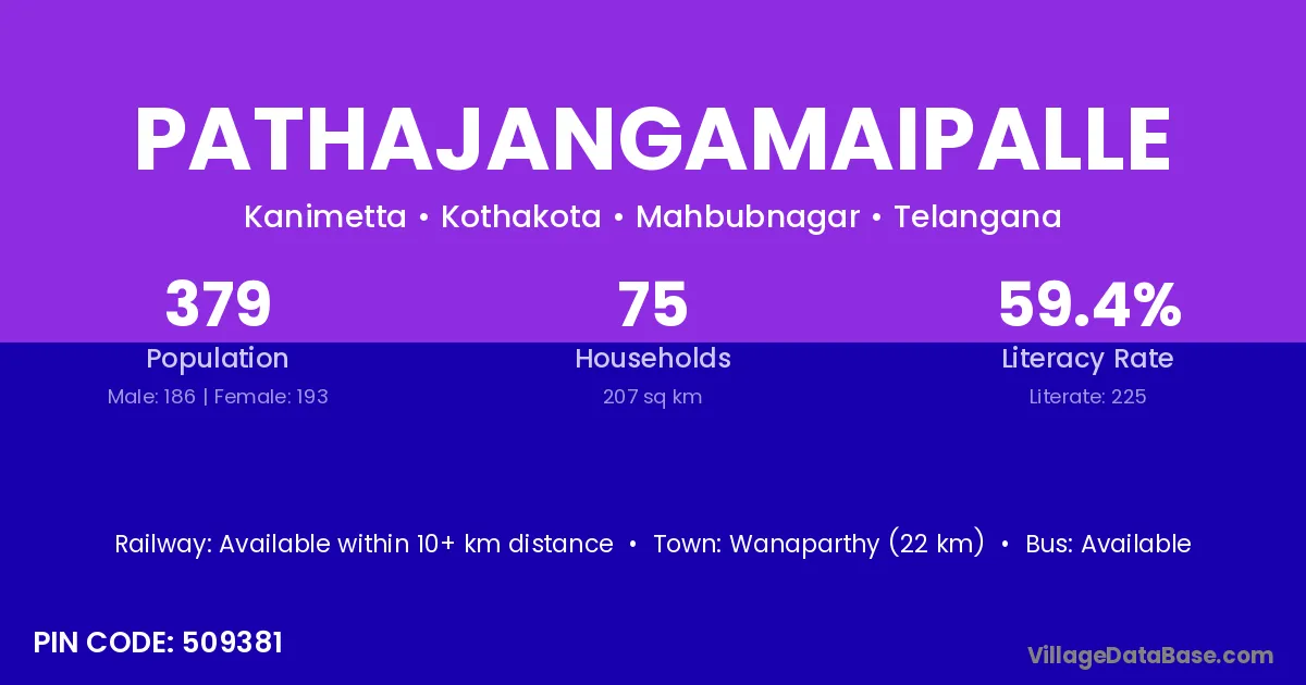 Wanaparthy (22 km) is the nearest town to Pathajangamaipalle village for major economic activities and is located approximately 22 km away.