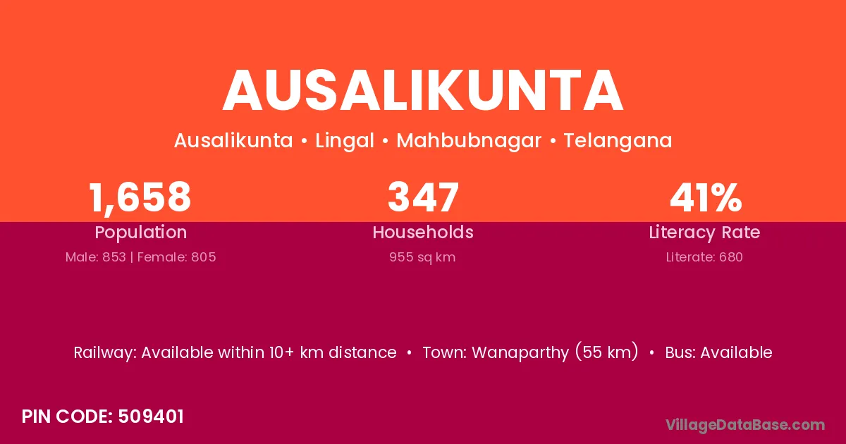 Wanaparthy (55 km) is the nearest town to Ausalikunta village for major economic activities and is located approximately 55 km away.
