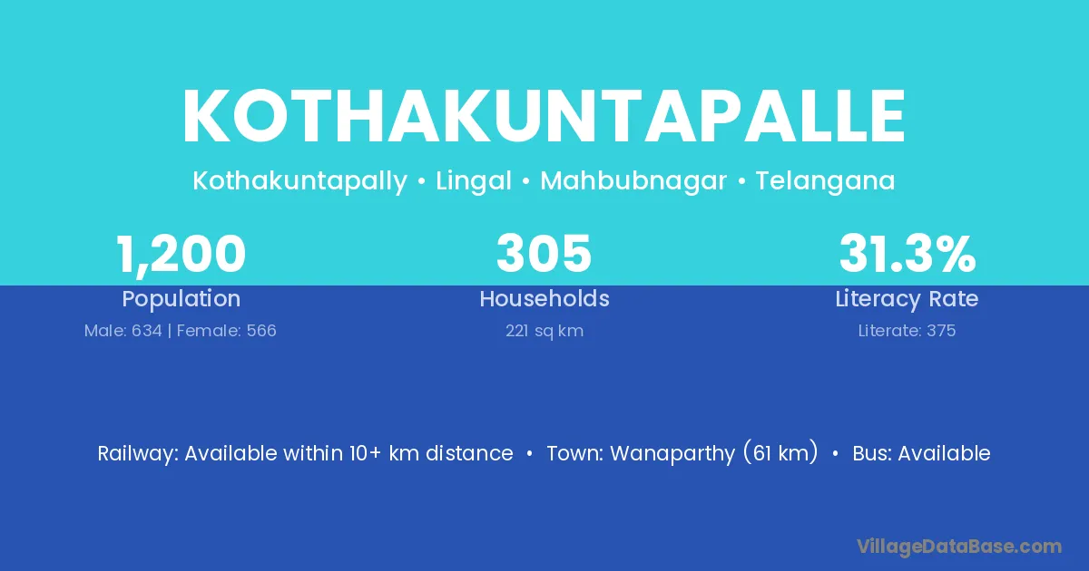 Kothakuntapalle village has a total population of 1,200 people, of which 634 are males and 566 are females.
