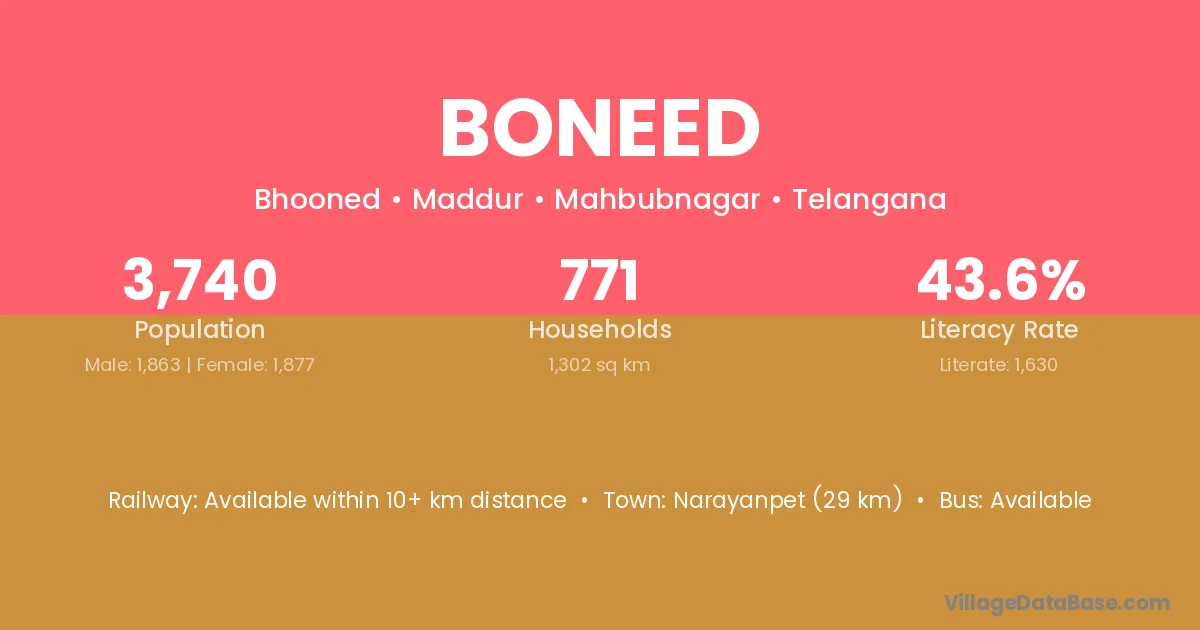Narayanpet (29 km) is the nearest town to Boneed village for major economic activities and is located approximately 29 km away.