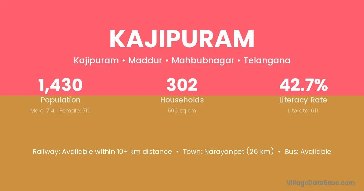 Narayanpet (26 km) is the nearest town to Kajipuram village for major economic activities and is located approximately 26 km away.