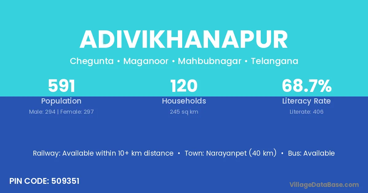 Narayanpet (40 km) is the nearest town to Adivikhanapur village for major economic activities and is located approximately 40 km away.