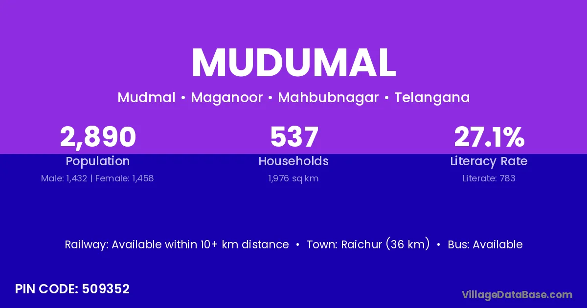 Raichur (36 km) is the nearest town to Mudumal village for major economic activities and is located approximately 36 km away.