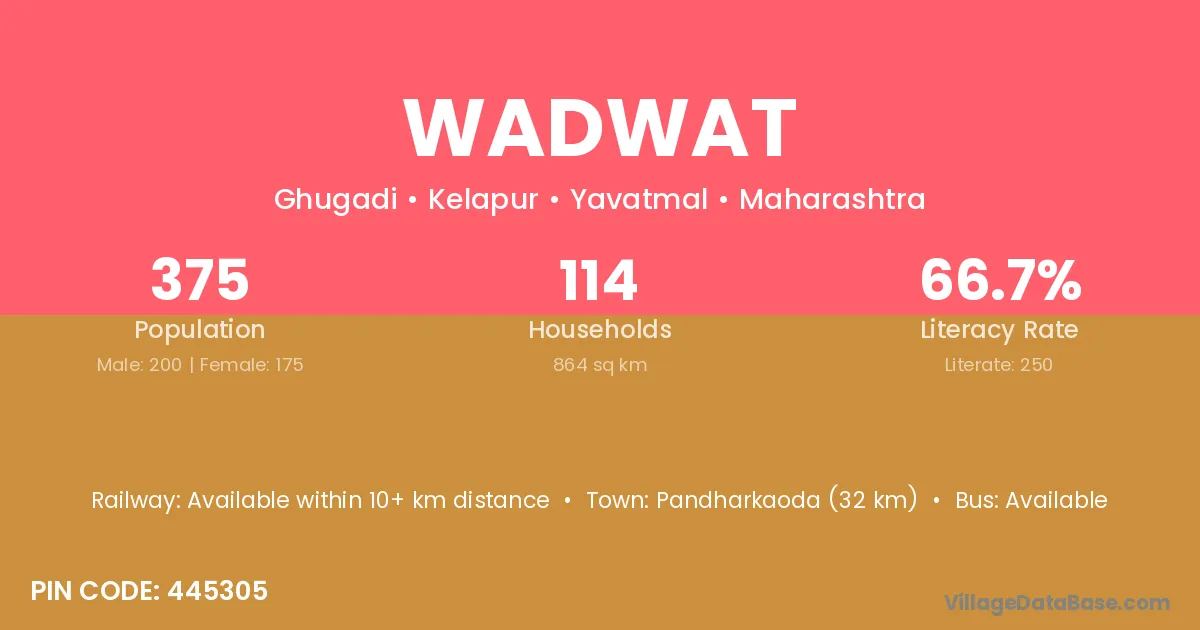 The literacy rate of Wadwat village is 37.93%. Male literacy stands at 49.42% and female literacy at 26.41%.