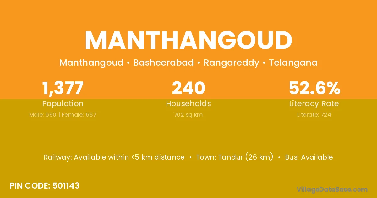Narayanpet (40 km) is the nearest town to Manthangoud village for major economic activities and is located approximately 40 km away.