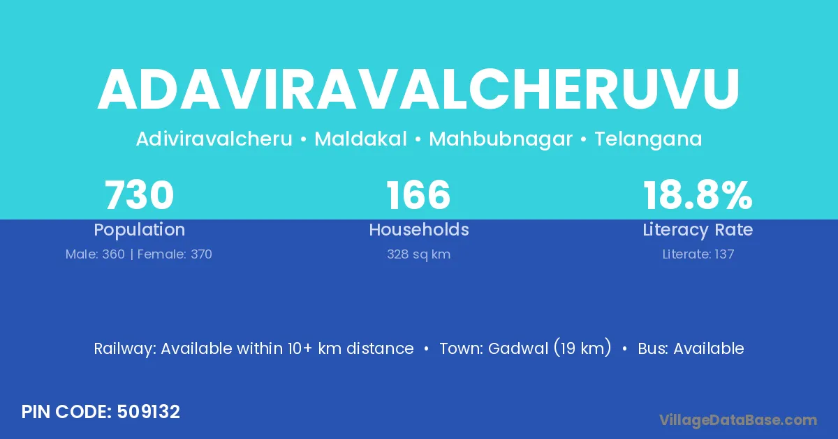 Gadwal (19 km) is the nearest town to Adaviravalcheruvu village for major economic activities and is located approximately 19 km away.