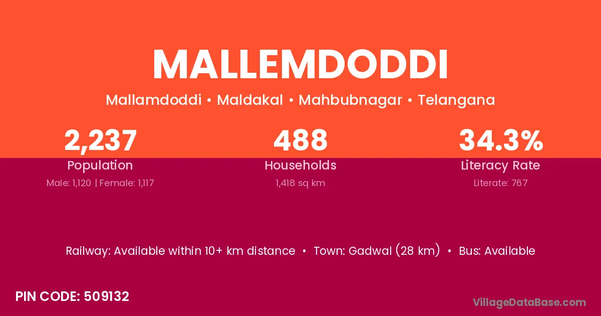 Mallemdoddi village has a total population of 2,237 people, of which 1,120 are males and 1,117 are females.