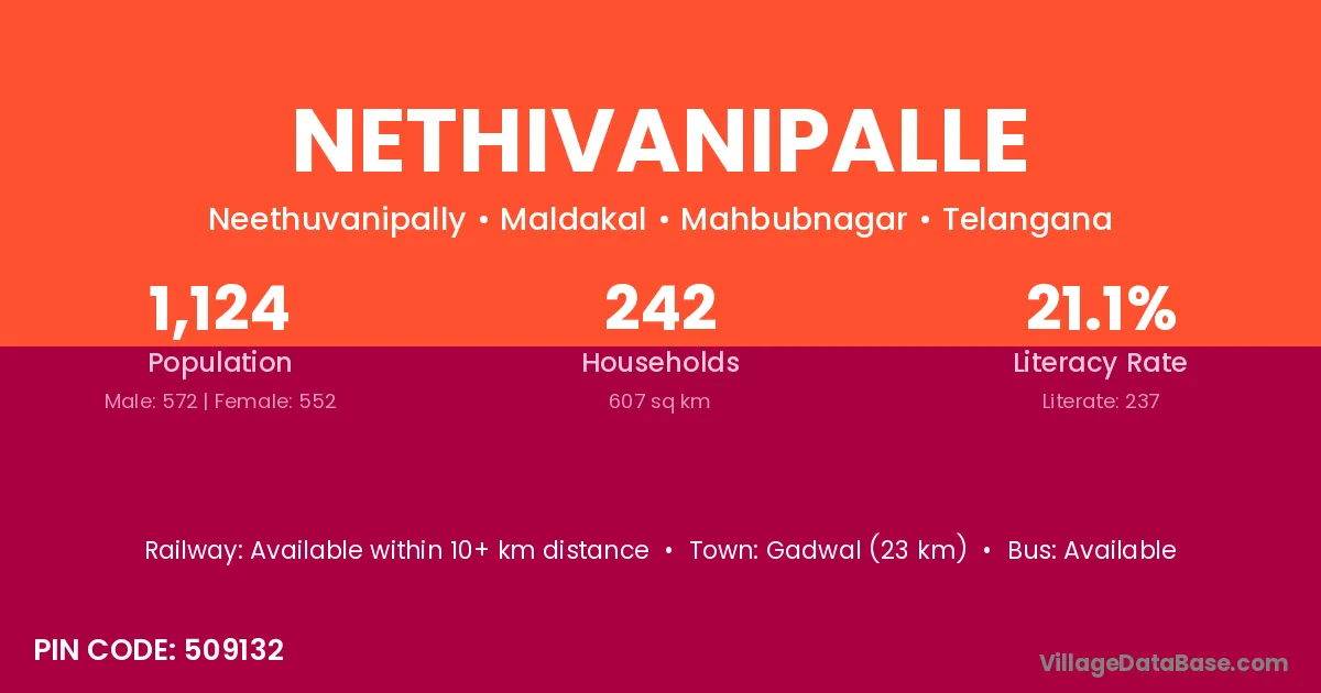 Gadwal (23 km) is the nearest town to Nethivanipalle village for major economic activities and is located approximately 23 km away.