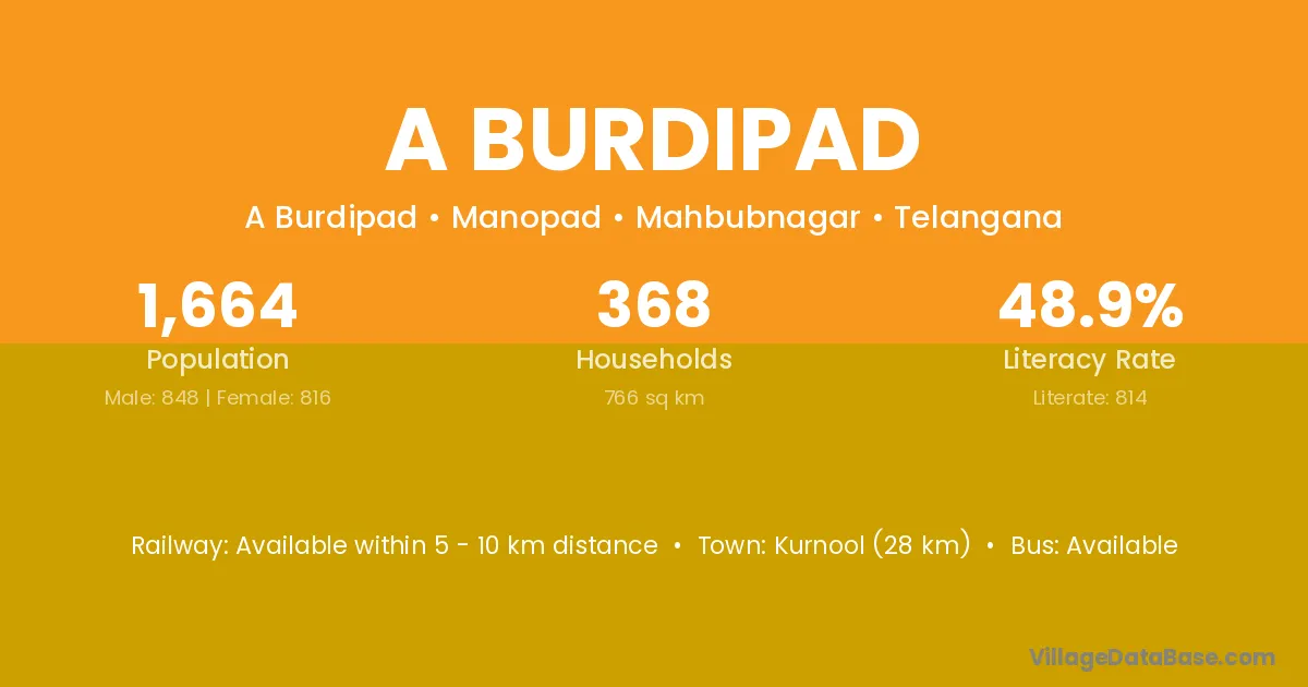 Kurnool (28 km) is the nearest town to A Burdipad village for major economic activities and is located approximately 28 km away.