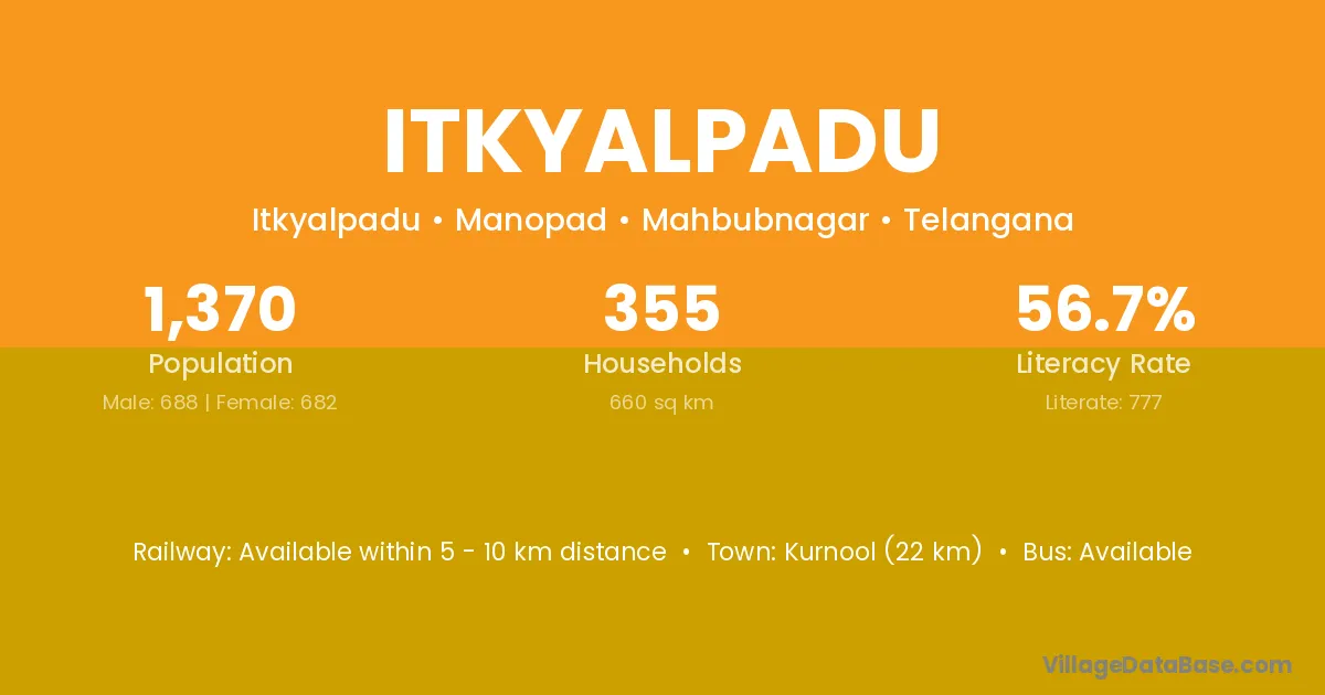 Kurnool (22 km) is the nearest town to Itkyalpadu village for major economic activities and is located approximately 22 km away.
