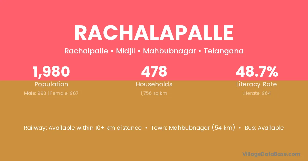 Mahbubnagar (54 km) is the nearest town to Rachalapalle village for major economic activities and is located approximately 54 km away.