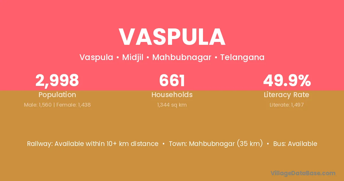 Mahbubnagar (35 km) is the nearest town to Vaspula village for major economic activities and is located approximately 35 km away.
