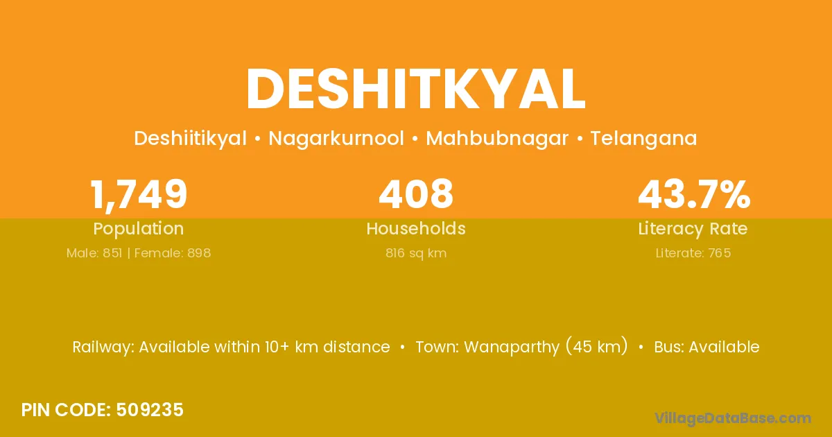 Wanaparthy (45 km) is the nearest town to Deshitkyal village for major economic activities and is located approximately 45 km away.