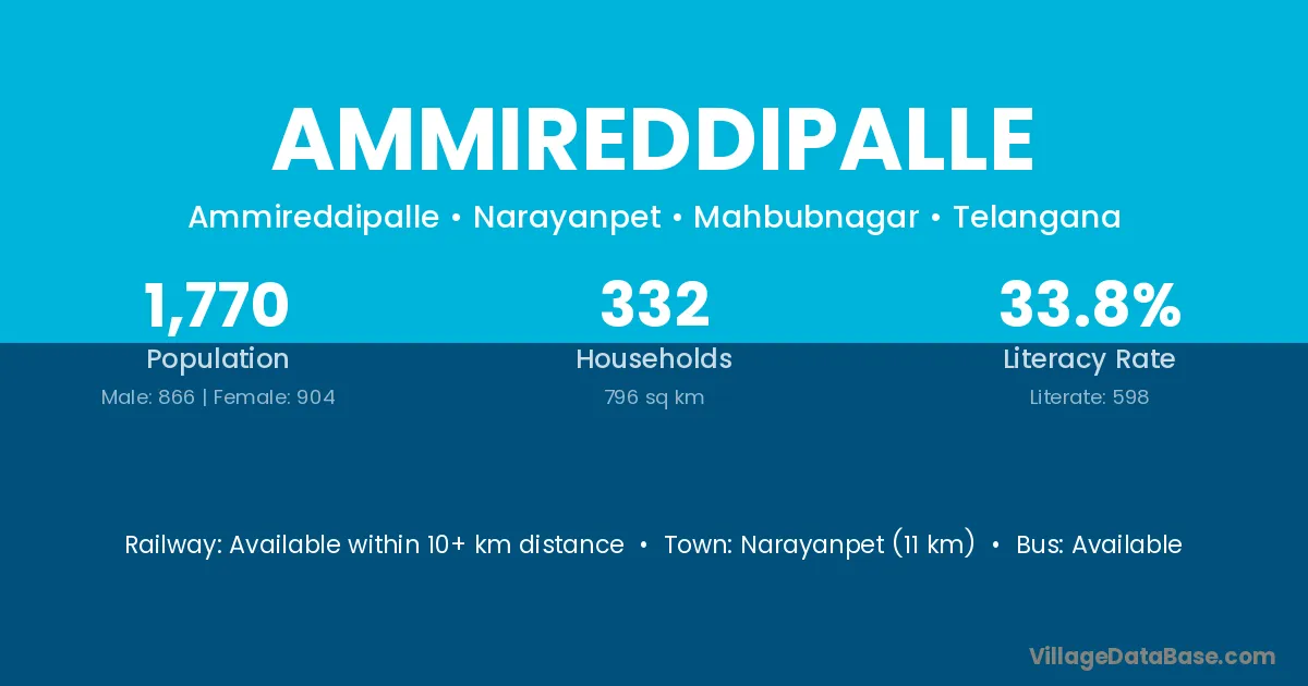 Narayanpet (11 km) is the nearest town to Ammireddipalle village for major economic activities and is located approximately 11 km away.