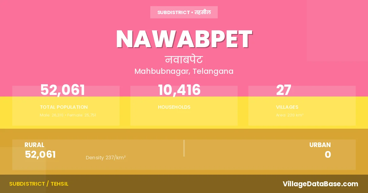 According to the 2011 census The total area of Nawabpet Mandal is 220 km², with a population of 52061 people. The population density is 237 inhabitants per square kilometre, and there are approximately 10416 houses in the sub district.