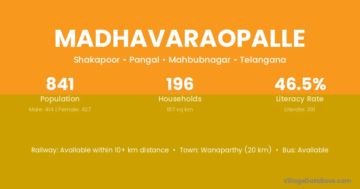 Wanaparthy (20 km) is the nearest town to Madhavaraopalle village for major economic activities and is located approximately 20 km away.