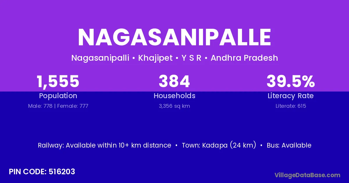 Wanaparthy (26 km) is the nearest town to Nagasanipalle village for major economic activities and is located approximately 26 km away.