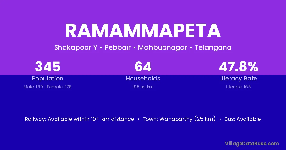 Wanaparthy (25 km) is the nearest town to Ramammapeta village for major economic activities and is located approximately 25 km away.
