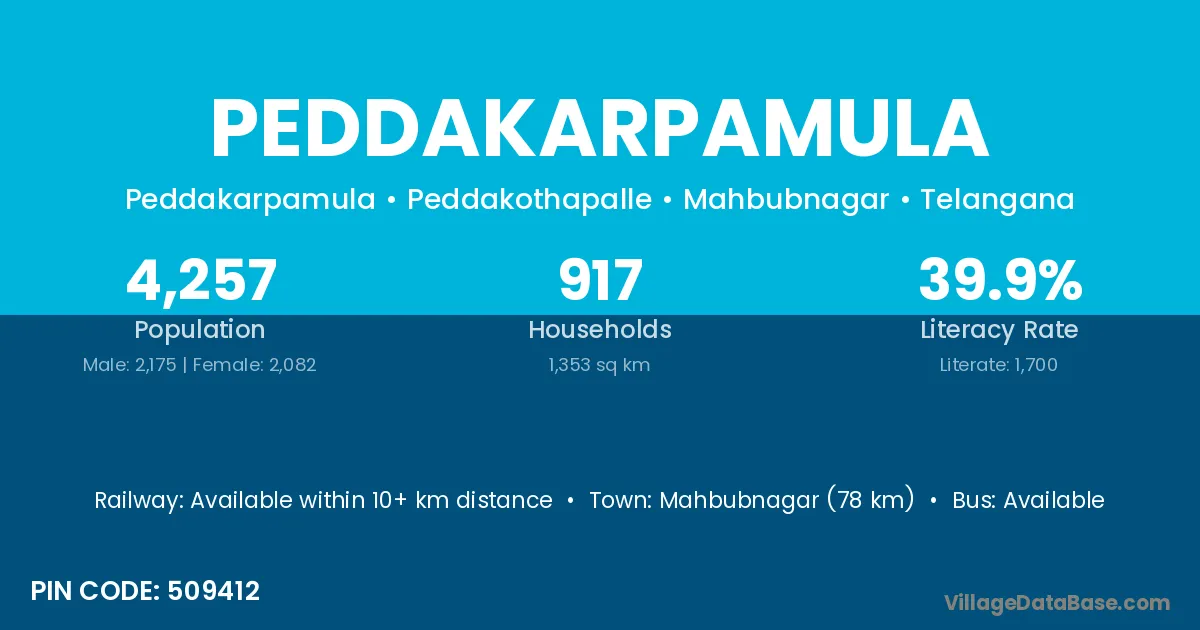 Mahbubnagar (78 km) is the nearest town to Peddakarpamula village for major economic activities and is located approximately 78 km away.